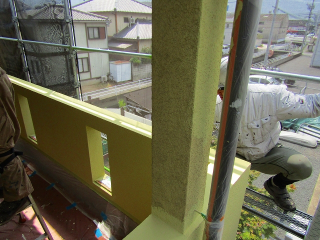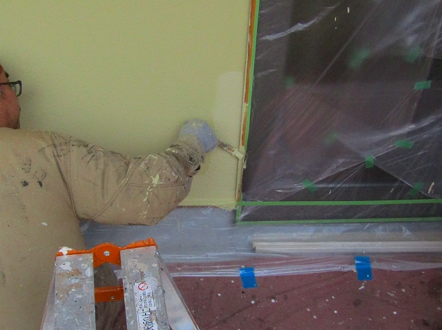 - 外壁の上塗りをしています。上塗りは自然な風合いを表現できるアートフレッシュを塗装しました。
