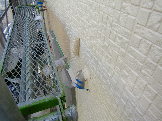 - 外壁の上塗り1回目の塗装です。無機塗料で耐久性が高く艶も美しい塗料です。