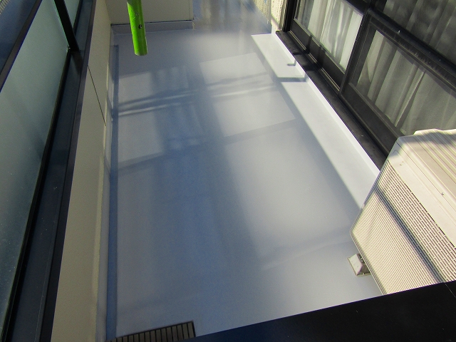 - バルコニー防水工事の完成です。バルコニーは塗装の防水ではもちません。歩ける平場にするには、防水工事で防水層を形成することが重要です。