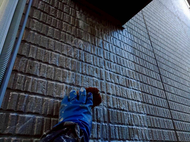 - 外壁の上塗り1回目を塗装しています。このあともう1回重ねて仕上げていきます。