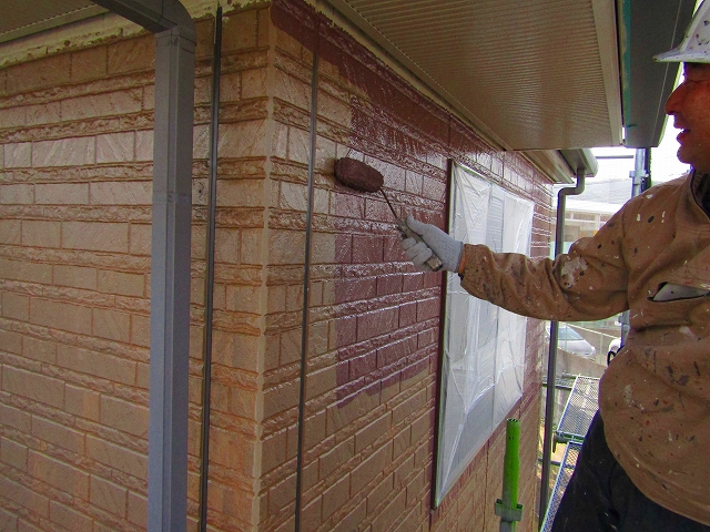 - 外壁の上塗り1回目を塗装しています。サイディングのデザインの凹凸の深さに合わせたローラーで塗装します。