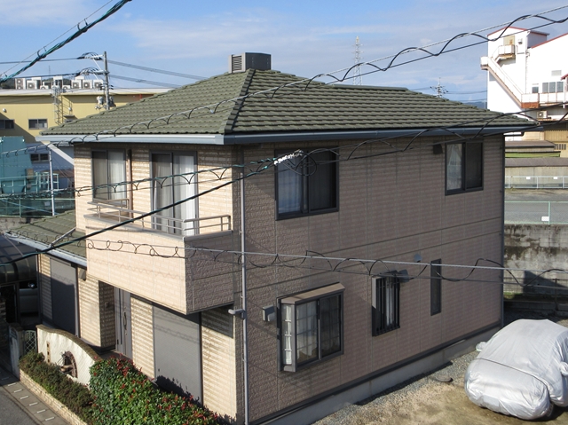 - 塗装前の全景です。屋根は陶器瓦で特に問題はありませんでしたが、板金部はサビていくので塗装をします。