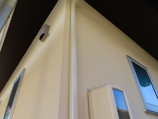 - 施工前の全景です。外壁はアイボリーで色褪せは目立ちませんが、塗膜の機能は落ちているので、汚れやコケが付きやすい状態でした。クラックも少しありました。