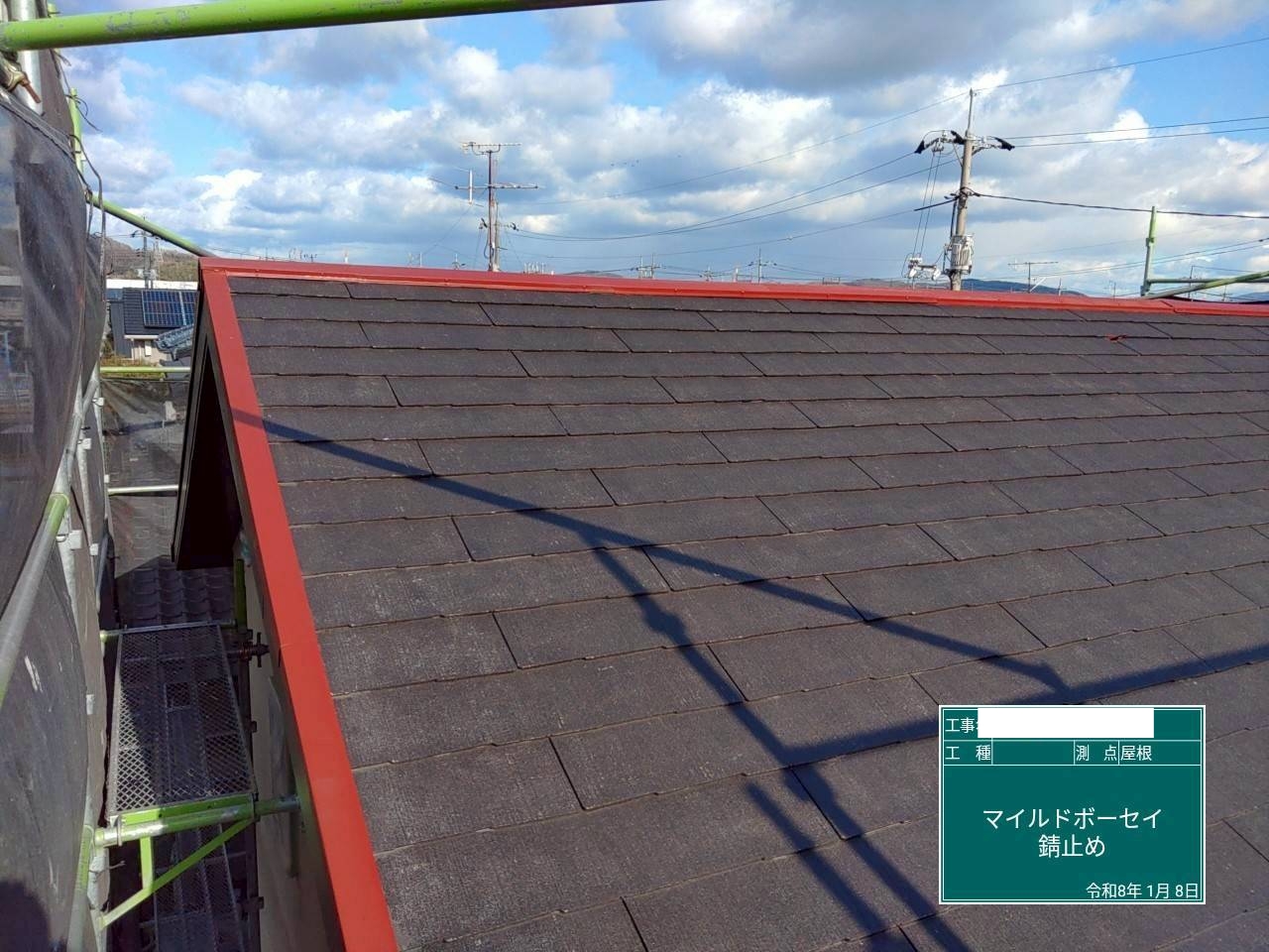 - 屋根の鉄部(棟、隅棟)はサビを防ぐマイルドボーセイを塗装して、上塗りを塗装します。