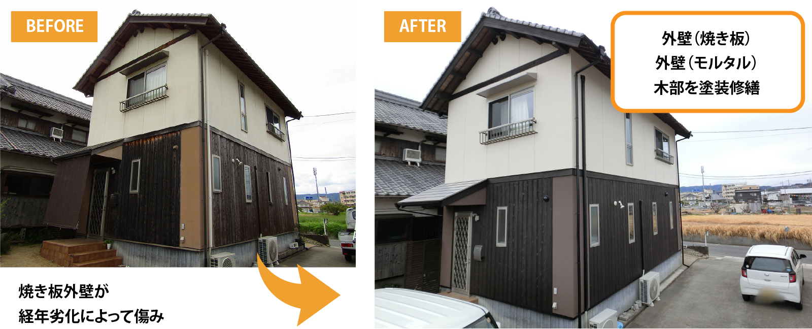焼き板は下地の防水処理がかなり重要な素材です。塗夢では国家資格をもった自社職人が徹底して下地処理を行い、表の焼き板がより長く美観を保てるよう施工します。
